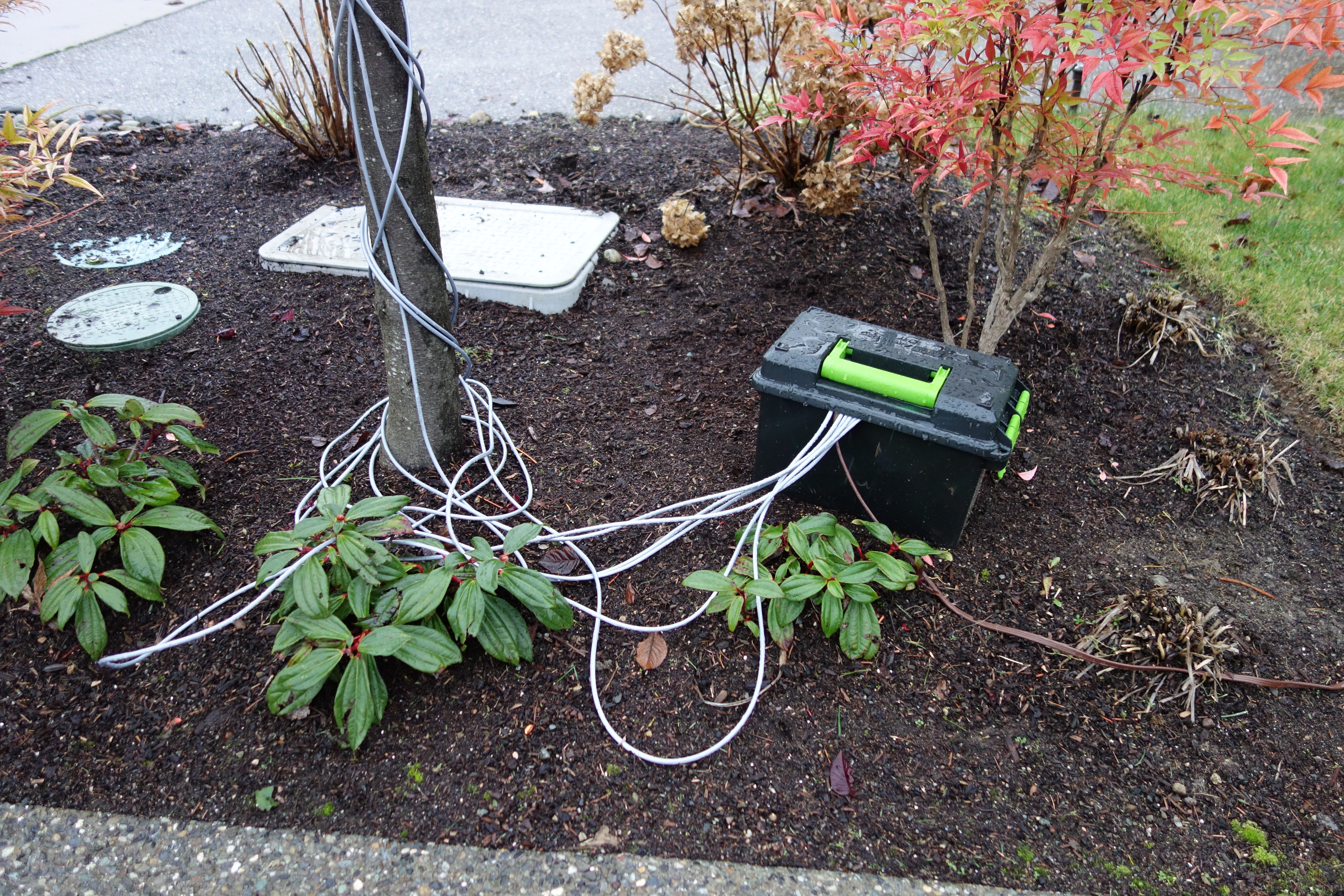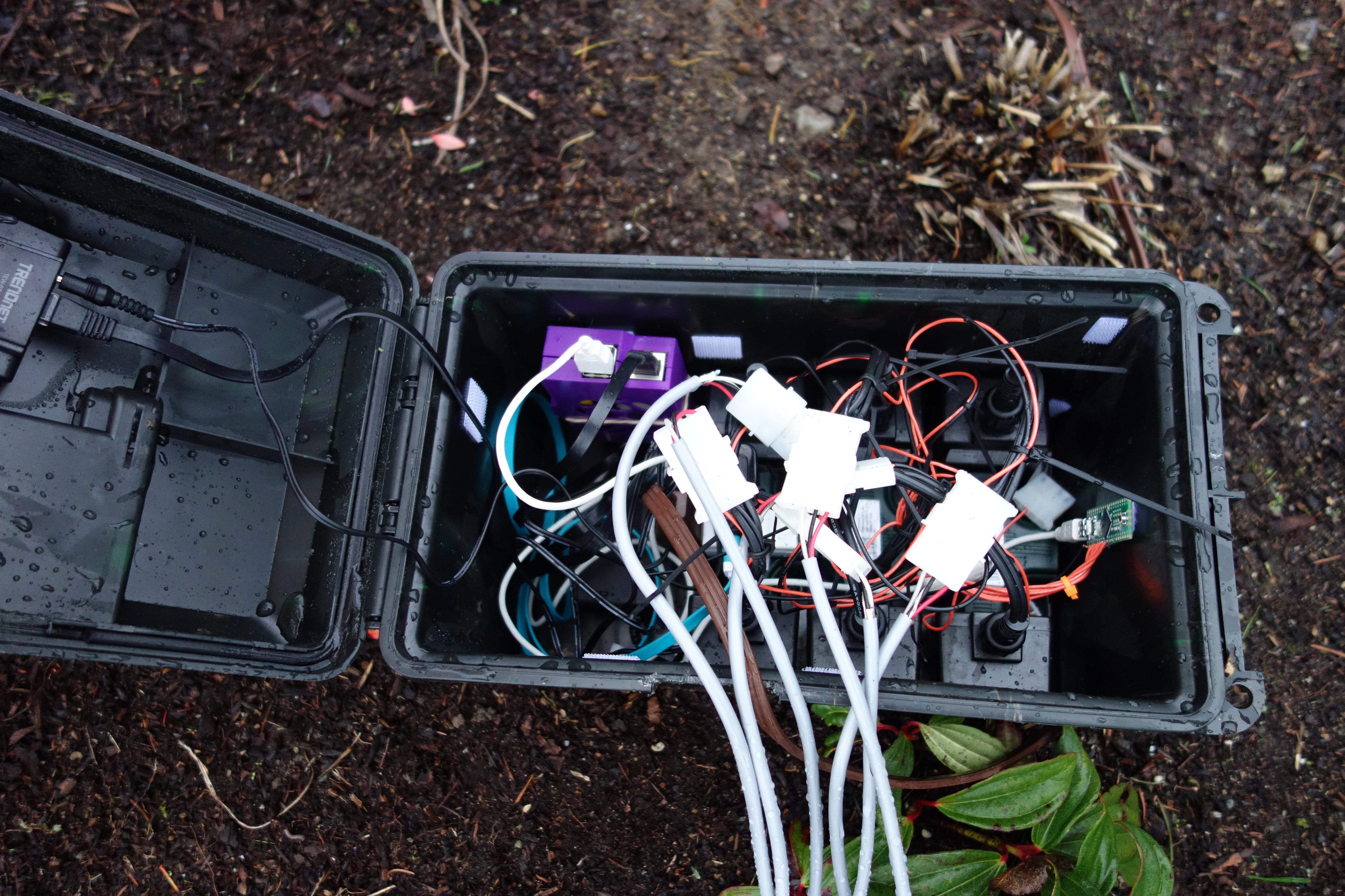 Basically I cut the cords, extended all the wires and crimped on molex connectors so that everything wouldn't have to be hooked up together all the time. Originally I was planning to use an ATX power supply to drive the lights, but when I hooked up the lights to the ATX power supply, the 5v rail dropped down to less than 4 volts and the PSU turned itself off, so I had to go back and use the original power supplies that came with the lights. The whole thing is housed inside a cheap ammo box, which is pretty much water proof. However, I had to cut a hole to get the cables in and out, and even though that hole is well covered by the lid, the water finds its way into the box. Currently the water collects in the bottom, which doesn't bother the original wall warts very much, but could have been a real problem for the ATX power supply. I need to drill some holes in the bottom of the box to let the water drain out. For now I just empty out the box every few days. Maybe next year I'll build something that is properly waterproof. (The water-proof connectors are like $20 per light string though, which is why I just cut a hole this time.)