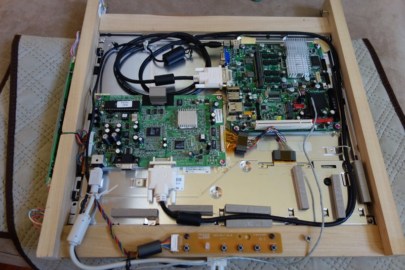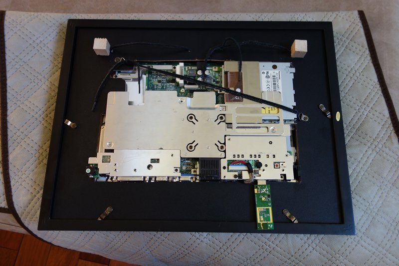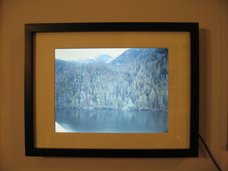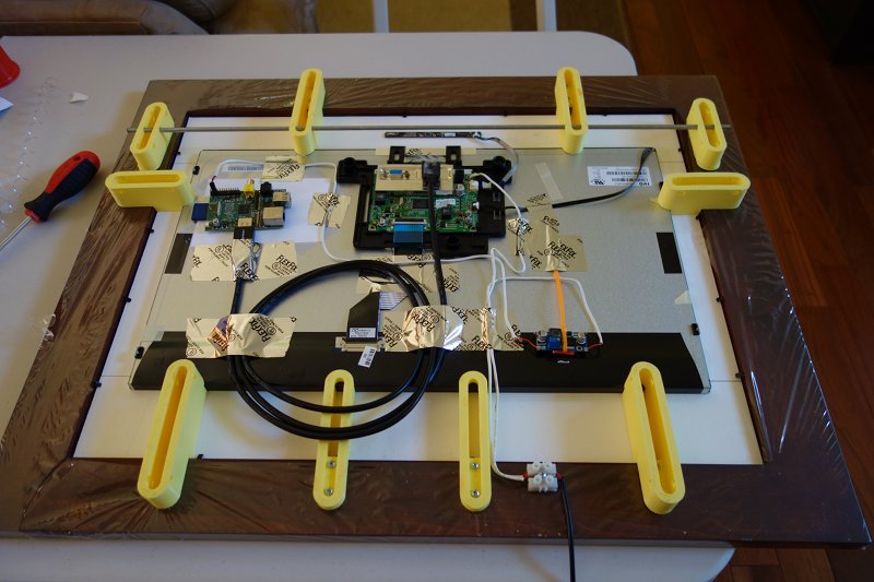 There are lots of ways to build a digital picture frame. So far I have built three. Method #1My first digital picture frame was built from an old laptop. (Which was already old in 2007, when I built it.) Basically you just take it apart and remove as many parts as you can, including battery, plastic parts, floppy, cdrom, keyboard (if it will boot without it), etc. Then you fold the screen around the back of the laptop and find a way to mount it in a picture frame. The nice part about this is that the laptop is an all-in-one thing, and you might already have one collecting dust in a closet somewhere. The not-so-nice part is the software, each laptop is it's own little galaxy of pseudo-supported hardware, so good luck with that. :) This is what that first picture frame looked like from the back:![]() ![]() ![]() Method #2The second frame I build was built around wood frame made of 1-by-2's. The food frame holds the monitor panel, and hangs on the wall. Originally, I used an industrial Intel motherboard for this, which worked really well, but after I wrote pi-ctureframe, I replaced it with a raspberry pi. The raspberry pi is basically taped to the back of the panel. The wood frame then hangs on the wall, and a standard picture frame is then hung in front of the panel. Here is what it looks like from the back:![]() ![]() ![]() ![]() Method #3My third frame was build using 3d-printed framing fingers. This is by far my preferred method as it can easily be adapted to any monitor or panel, and requires the least amount of hands-on work. Here is what it looks like from the back:![]() ![]() Getting the right monitorGetting the right monitor for building a digital picture frame is not easy. Almost all monitors on the market has a 16:9 aspect, and most digital cameras takes pictures that are 4:3 or 3:2. This means that you either have to crop your pictures a lot, or you end up with black bars on the side of your pictures. My software does a little of both, it crops pictures up to a specified percentage, and fills out the rest with black bars. However, if you can find a monitor that is is not wide-screen, it will look a lot better. A 21-inch 3:2 monitor would be perfect, but I'm not aware of any such monitor on the market.Additionally, you really want a monitor with a decent view angle. Unfortunately, many monitors have decent view angles only to the left and right, but your picture frame may and up hanging higher or lower than normal head height. For the last picture frame I built, I noticed that the picture looked funny when viewed from below the frame, so I mounted the panel upside down. There are options in /boot/config.txt that lets you rotate the picture back if you need to do something like this. You really want a panel that is as thin as possible. Unfortunately, many monitors have connectors that stick straight out the back of the monitor, which really makes it hard to mount it close to a wall. An angled hdmi cable might help, but a monitor that has the connectors going down is probably going to be a better choice. I prefer monitors that have external power bricks. What I usually do is that I upgrade the power brick to a more powerful one (but same voltage) and then I use a step-down converter to power the raspberry pi from the same power brick. That way I can have only one power cable, which seems cleaner to me. (Even though it really doesn't matter if the cables are hidden inside the wall anyways..) Don't forget that TV's are also LCD panels, sometimes TVs are cheaper than computer monitors. Beware that some smaller TVs have 720p native resolution, which isn't very good for a digital picture frame. SoftwareFor a long time, I was using Linux+X11 and some scripts to load images, but the raspberry pi has such nice support for OpenGL ES 2, that I decided to write some new software in C++. This software is called pi-ctureframe and is available here. Once you download it, just untar on your raspberry pi and compile it: (These instructions were written for raspbian, but may work on other distributions as well.)sudo apt-get install libexif-dev libjpeg-devPi-ctureframe will load pictures from one or more directories, scale them using a high-quality scaler and display a slideshow with nice OpenGL-based transitions. It will also open a web server on port 80 that you can use to rotate pictures and give it a thumbs up/down, here is a screenshot: ![]() As you can see, there are lots of filenames listed for this picture, this is because pi-ctureframe will scan all your pictures and if some of them are identical, it will treat them as a single picture. This means that even if you have a million copies of the same image, it will not show up more often than other pictures, and thumbs up/down and rotation will be applied to all the copies of the image. Setting up your raspberry piAfter you download and install raspbian, there are still a few things you need to do, like aking pi-ctureframe run automatically:echo >>/etc/rc.local '/usr/local/bin/pi-ctureframe --metadata_dir=/net/pictures/metadata_dir /net/pictures/pictures &'If you have a 256Mb raspberry pi, you might want to free up some memory by uninstalling some things: apt-get remove consolekit dbus triggerhappyIn general, the picture tends to be more stable if you add this option to /boot/config.txt: config_hdmi_boost=4Also you should probably turn off swap, as pi-ctureframe runs fine without it, and it will just end up aging your sdcard prematurely: echo CONF_SWAPSIZE=0 >/etc/dphys-swapfileI have my pictures on a NFS server, so I add these lines to /etc/fstab: mkdir -p /net/picturesI had some problems with using NFSv3 (raspberry crashed) but when I added vers=2, it worked better. If your pictures are on a windows/samba share, you'll need something like this instead: mkdir -p /net/picturesYou might also want to configure mDNS on your raspberry pi so that you can access the webserver with an easy-to-remember name. (I just use IP numbers myself. :) My file s