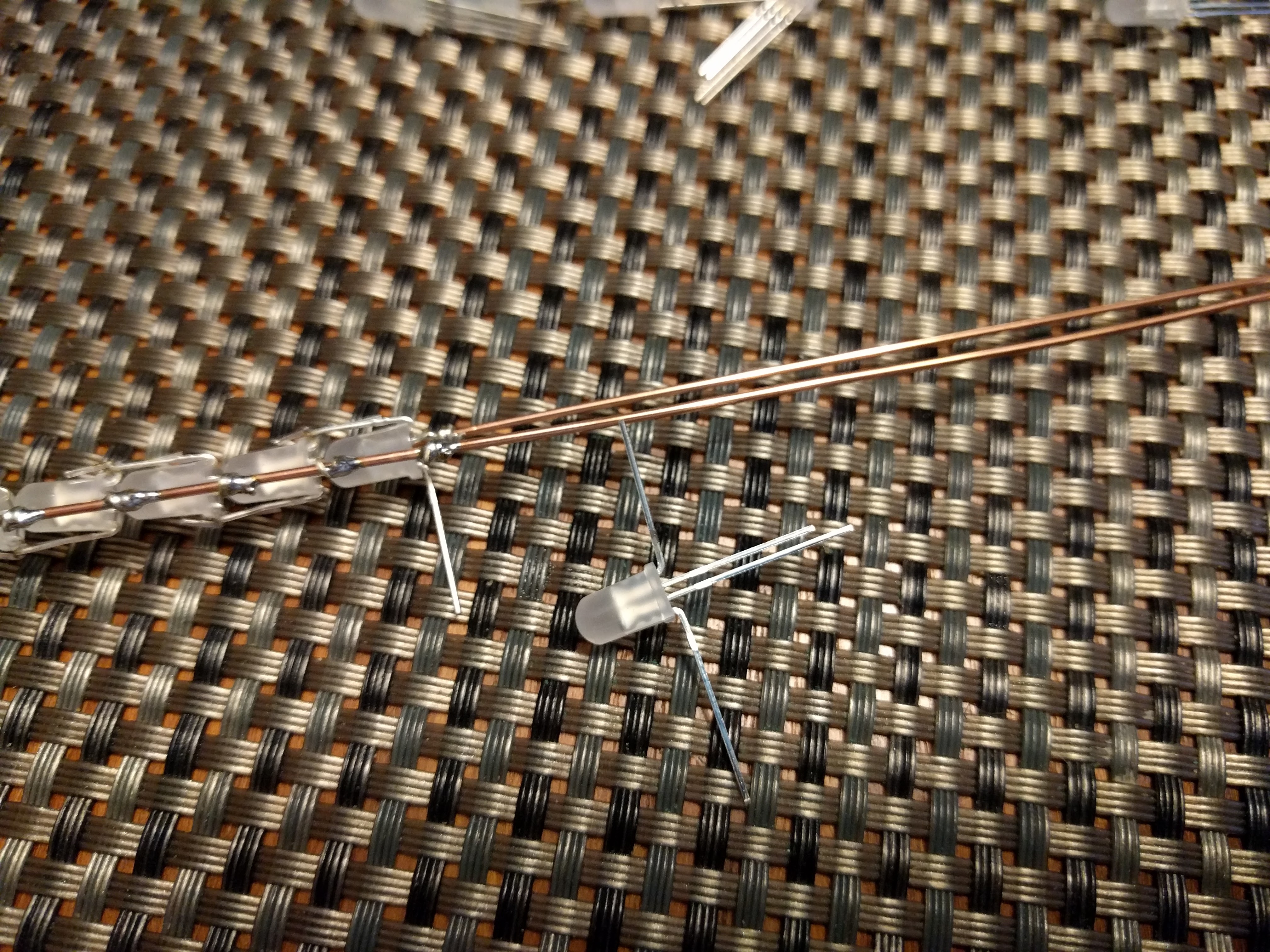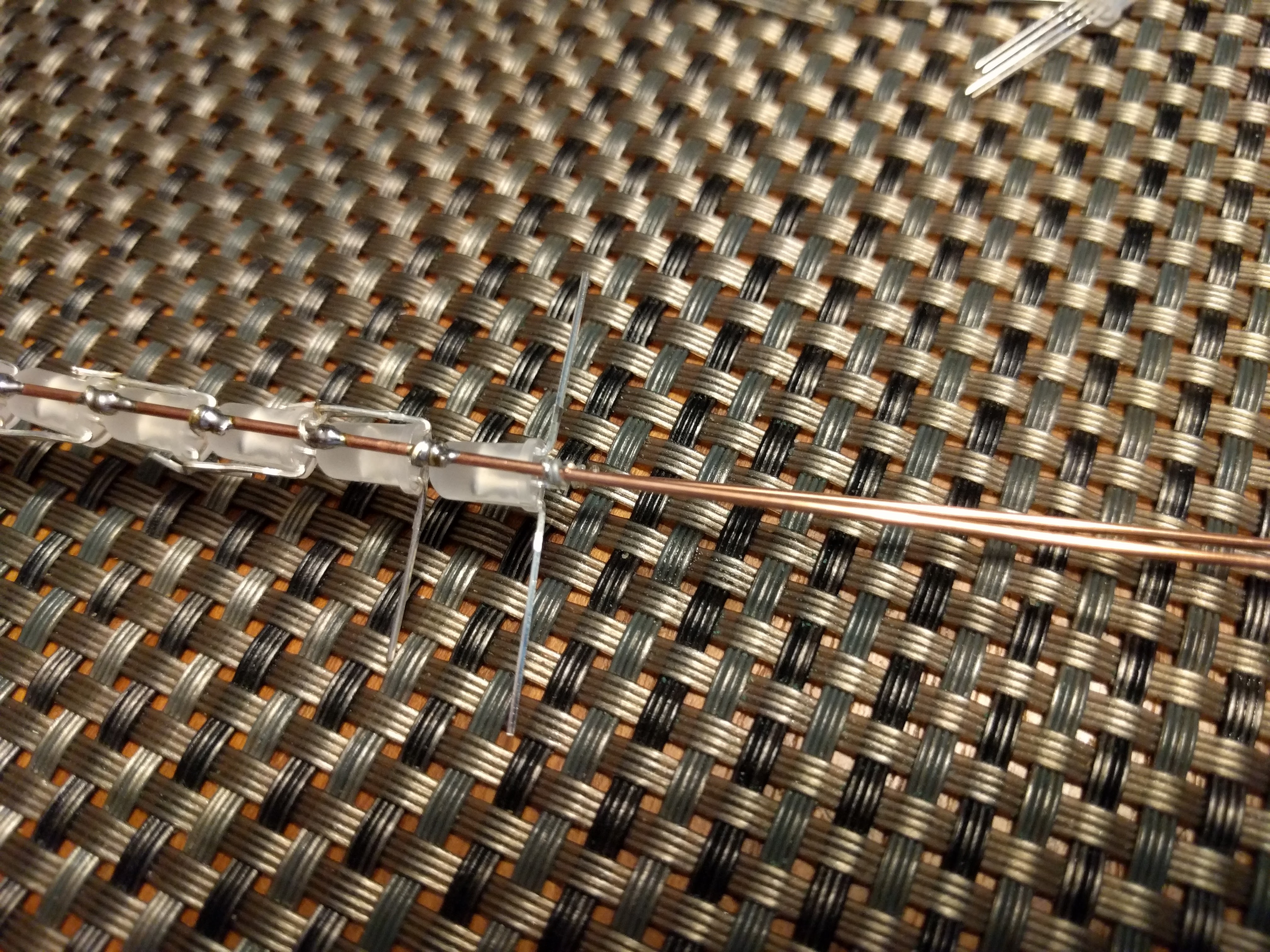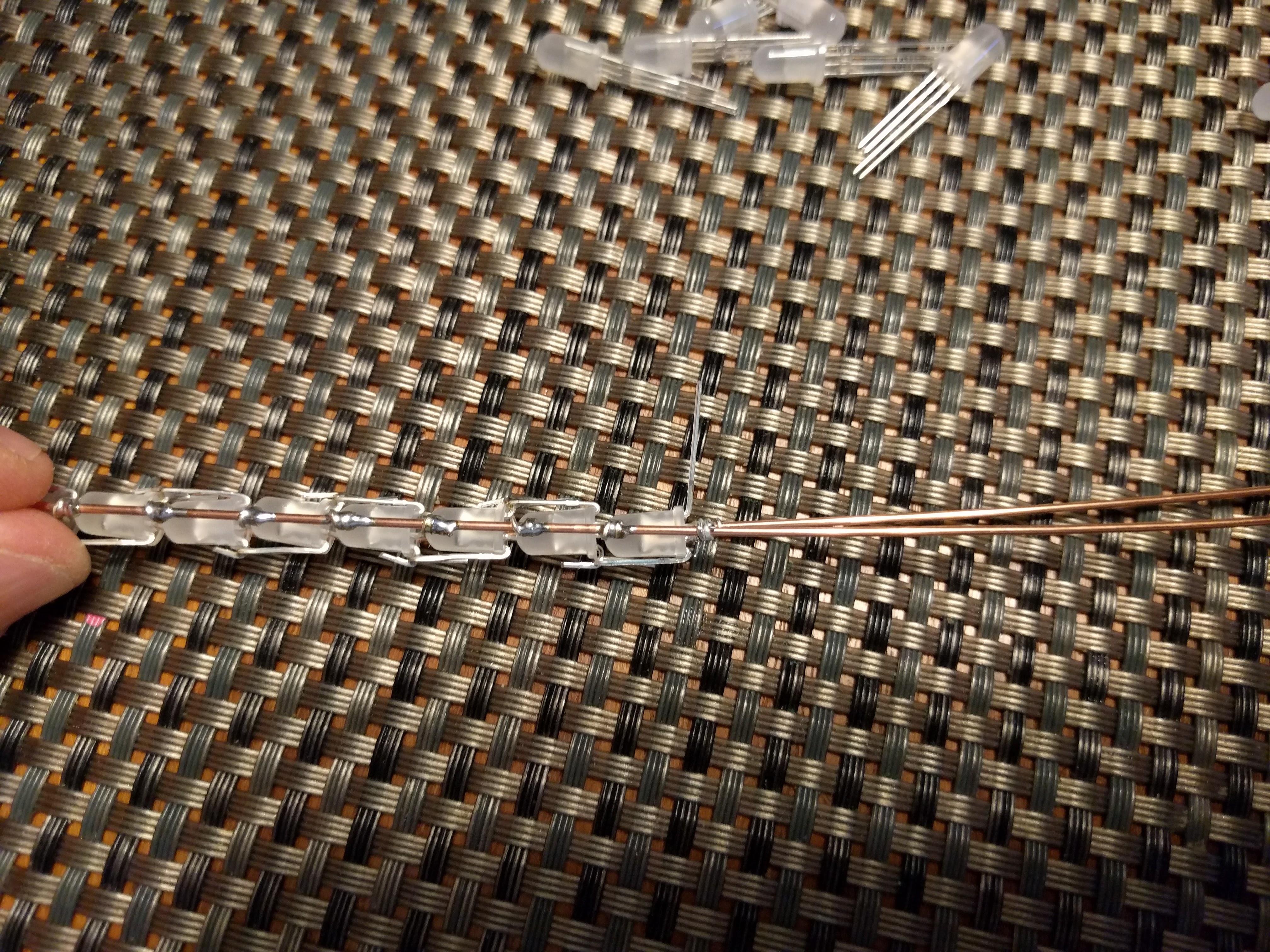 ![]() Here is how I built the LED string. ![]() Note how each LED is rotate 180 degrees from the previous one? That is so that the data out can connect to the data in on the next LED. During construction, I keep the "-" power rail on top at all times. I bend first and last pin straight out, then I position it so data out will connect with data in on the next LED, then I bend + and - to connect to the right rail. Then I wrap the power pins around the power rails, and finally I bend the data pins to connect together. The remaining pin will still be sticking straight out, and it will tell me how to position the next LED. ![]() ![]() ![]() ![]() ![]() Once the string is all wired up, all you need to is to wrap it in packing foam and insert it into the blade. Instead of me explaining it (poorly), please watch this excellent video. Once it's done, it should look something like this: ![]() ![]() My blade ended up with 97 PL9823 LEDs. Each LED can draw about 60mA when white, so that means the whole thing can draw nearly 6A, also, it seems to draw a bit more than that during brief flashes or right when you turn it on, so make sure you have a battery that can provide enough current. Problems? Questions? Suggestions? Check out The Crucible. Last modified: March 29th, 2021 - Design by Monica & Fredrik Hübinette |