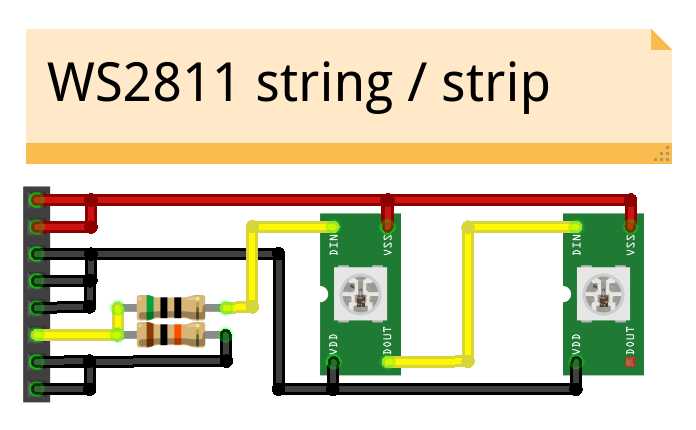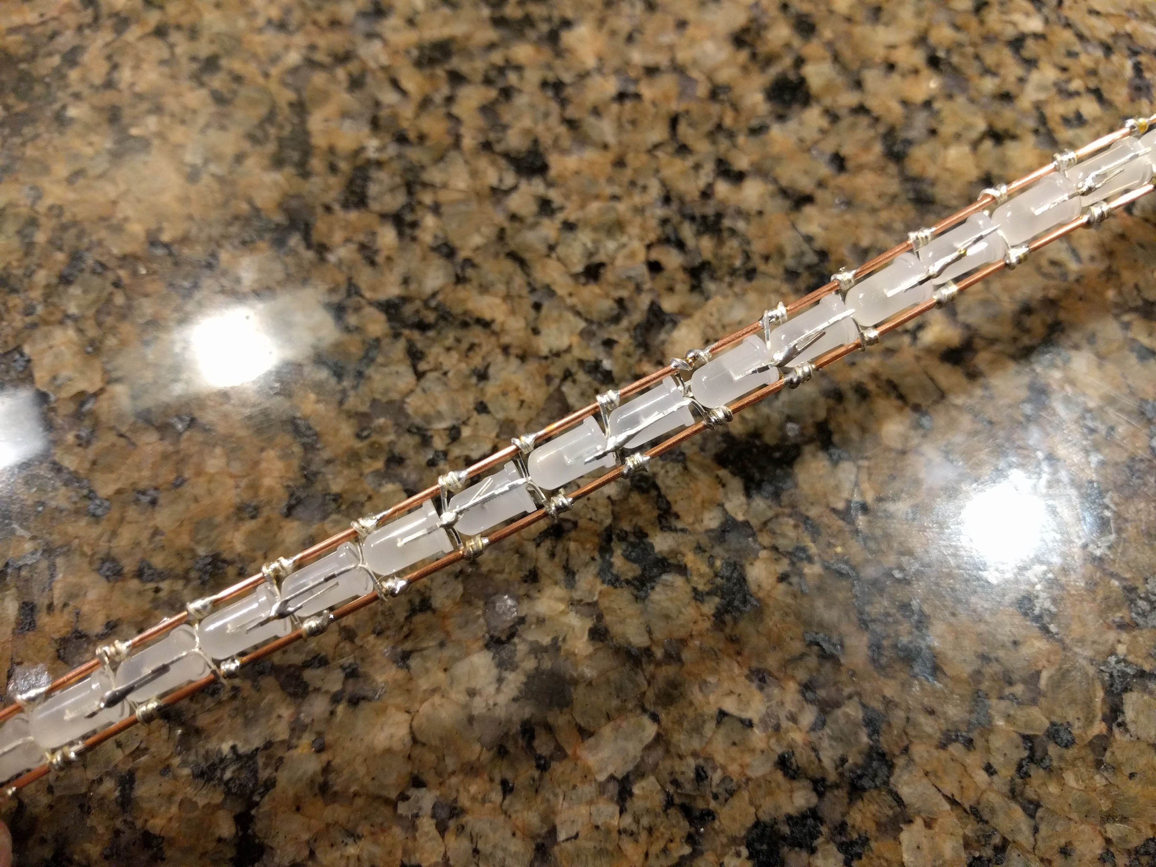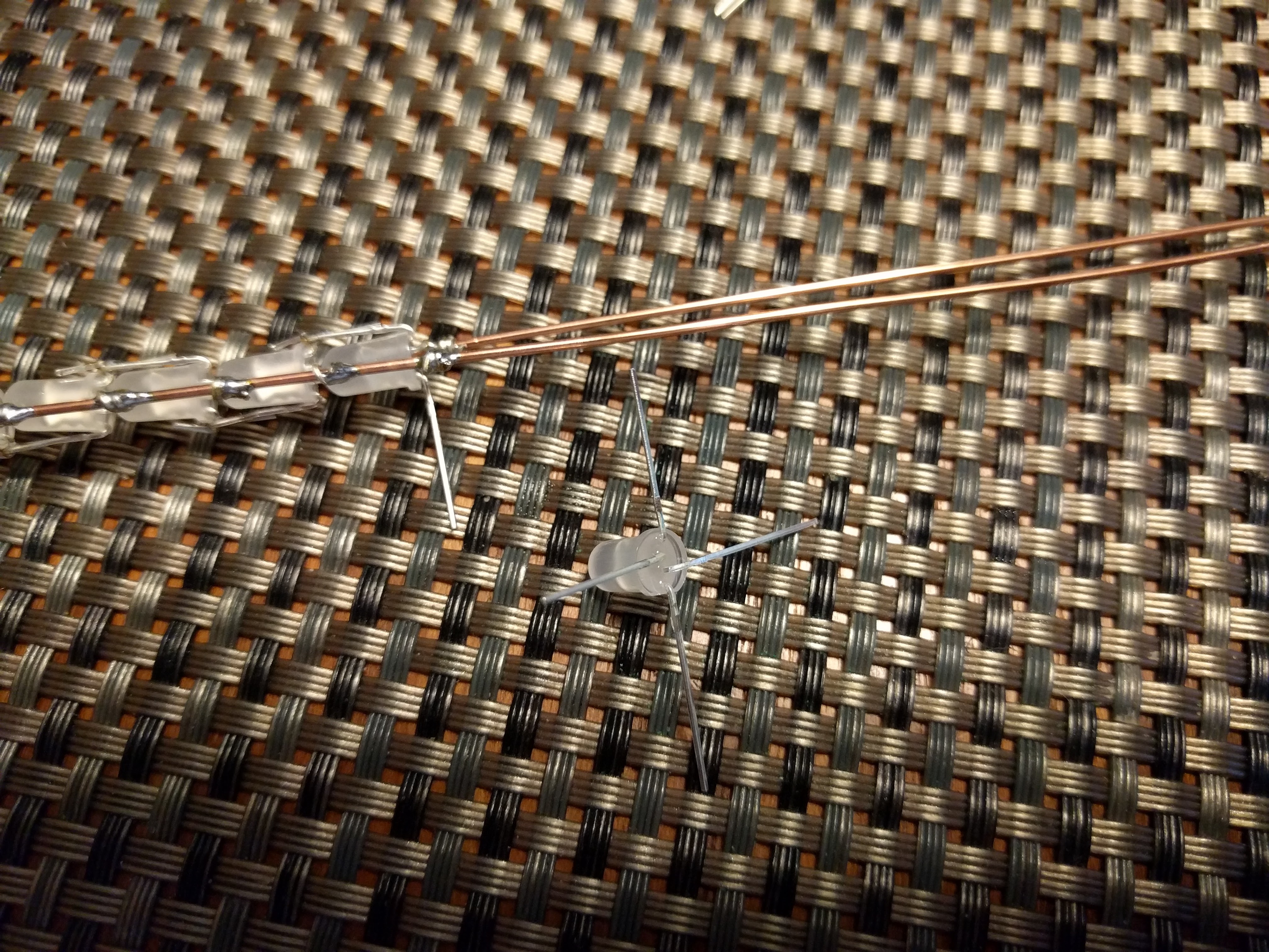 ![]() Here is how I built the LED string. ![]() Note how each LED is rotate 180 degrees from the previous one? That is so that the data out can connect to the data in on the next LED. During construction, I keep the "-" power rail on top at all times. I bend first and last pin straight out, then I position it so data out will connect with data in on the next LED, then I bend + and - to connect to the right rail. Then I wrap the power pins around the power rails, and finally I bend the data pins to connect together. The remaining pin will still be sticking straight out, and it will tell me how to position the next LED. ![]() ![]() ![]() ![]() ![]() Once the string is all wired up, all you need to is to wrap it in packing foam and insert it into the blade. Instead of me explaining it (poorly), please watch this excellent video. Once it's done, it should look something like this: ![]() ![]() My blade ended up with 97 PL9823 LEDs. Each LED can draw about 60mA when white, so that means the whole thing can draw nearly 6A, also, it seems to draw a bit more than that during brief flashes or right when you turn it on, so make sure you have a battery that can provide enough current. Problems? Questions? Suggestions? Check out The Crucible. Last modified: March 29th, 2021 - Design by Monica & Fredrik Hübinette |