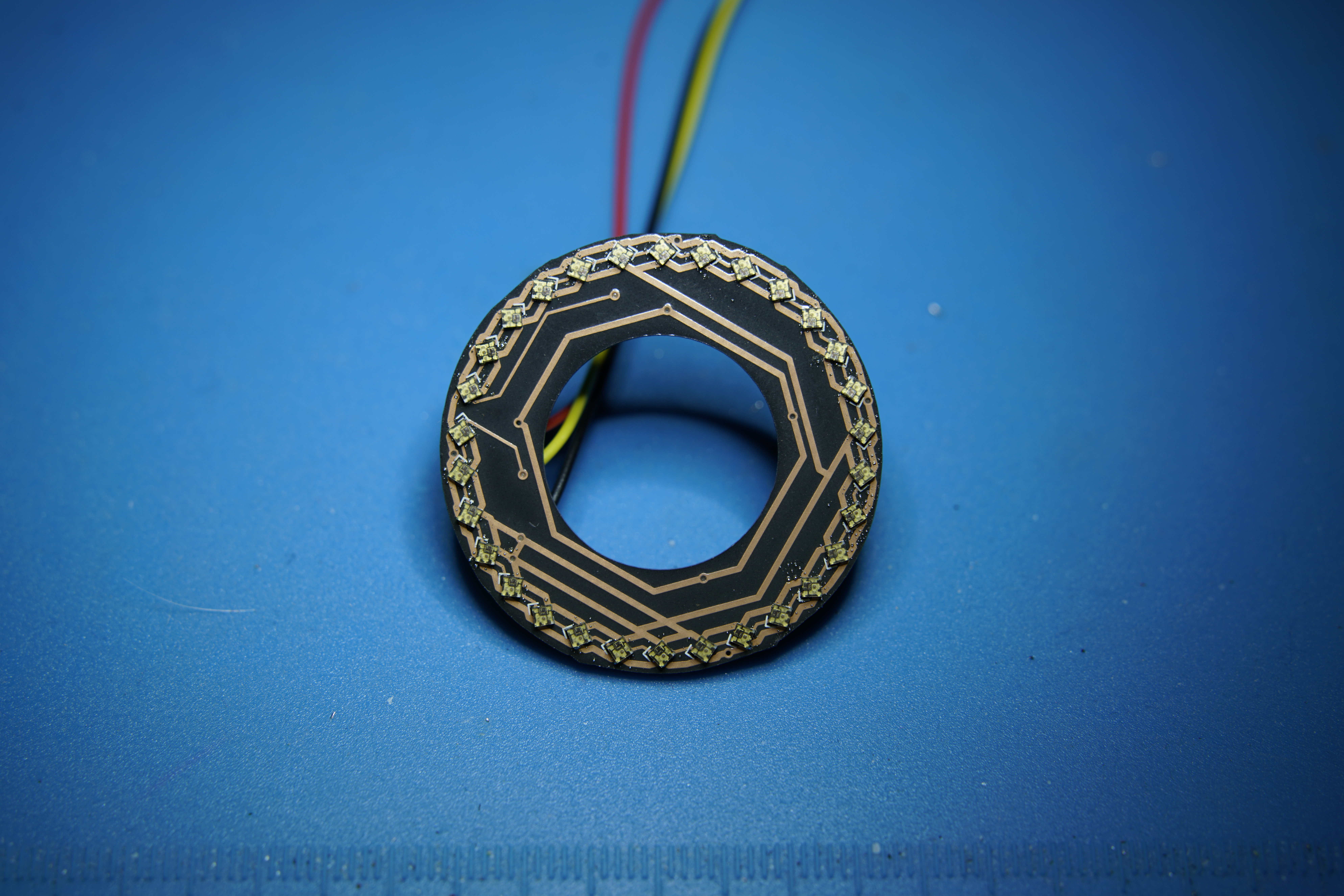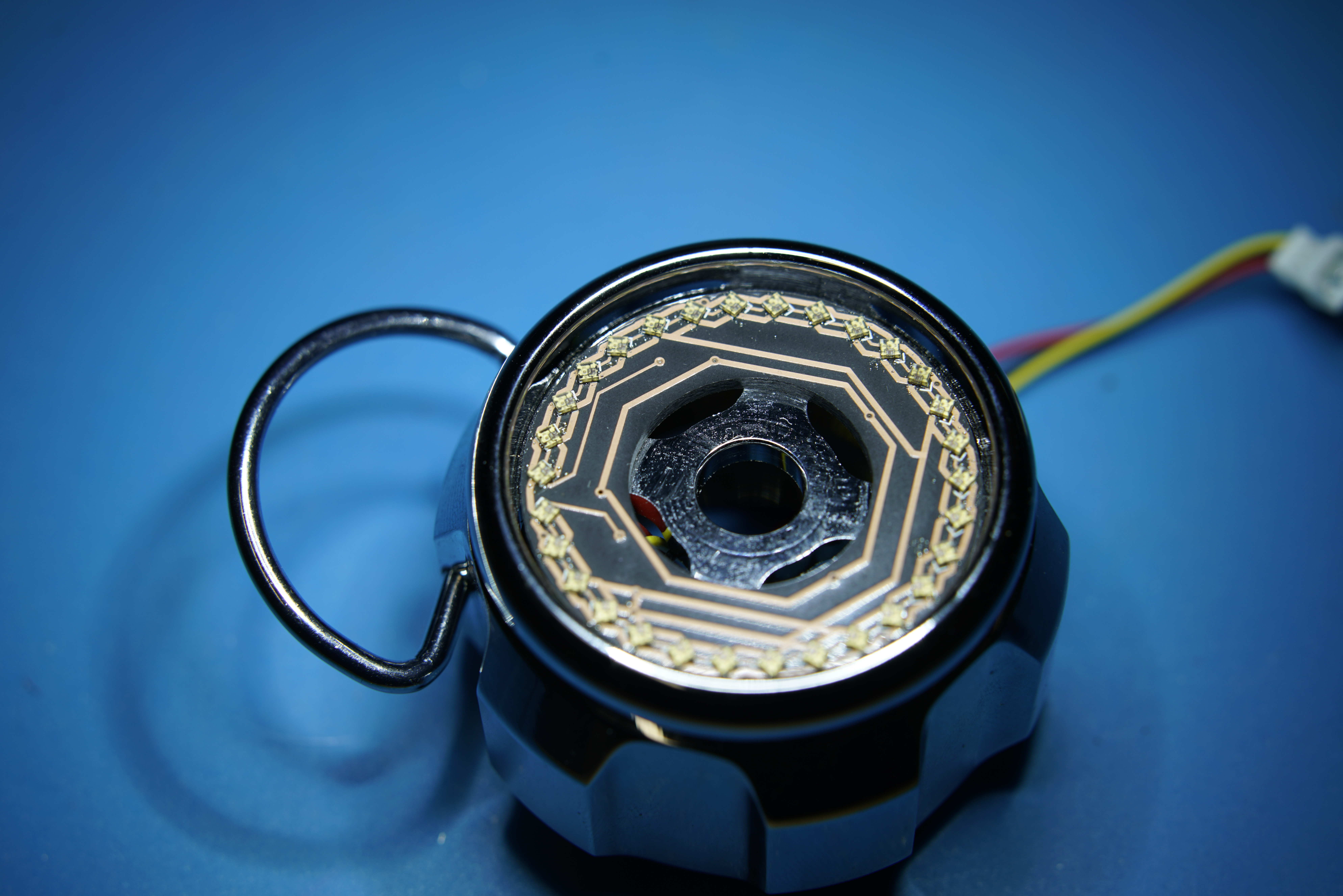 AssemblyThe Sk6805 LEDs are really fiddly to get right. You will almost certainly need a hot-air station, and you're probably going to need to test and re-work the LEDs a few times to get all 30 LEDs to work. There are 5 spots for 0603 resistors on the back of the PCB, but only one of them is really used. The others are there to hold the PCB in place. Once the PCB is put together, it shouldlook something like this:![]() Now we just need to pop it into the pommel. Then add the pommel cap and the PCB holder and screw everything together. Solder the other 3-pin connector to the pogo pin PCB. ![]() Then connect the two 3-pin connectors together and pop the pogo pin pcb into place. Make sure to twist everything a bit to wrap the wires around the PCB holder, or it won't fit. Then it should look like the top picture.