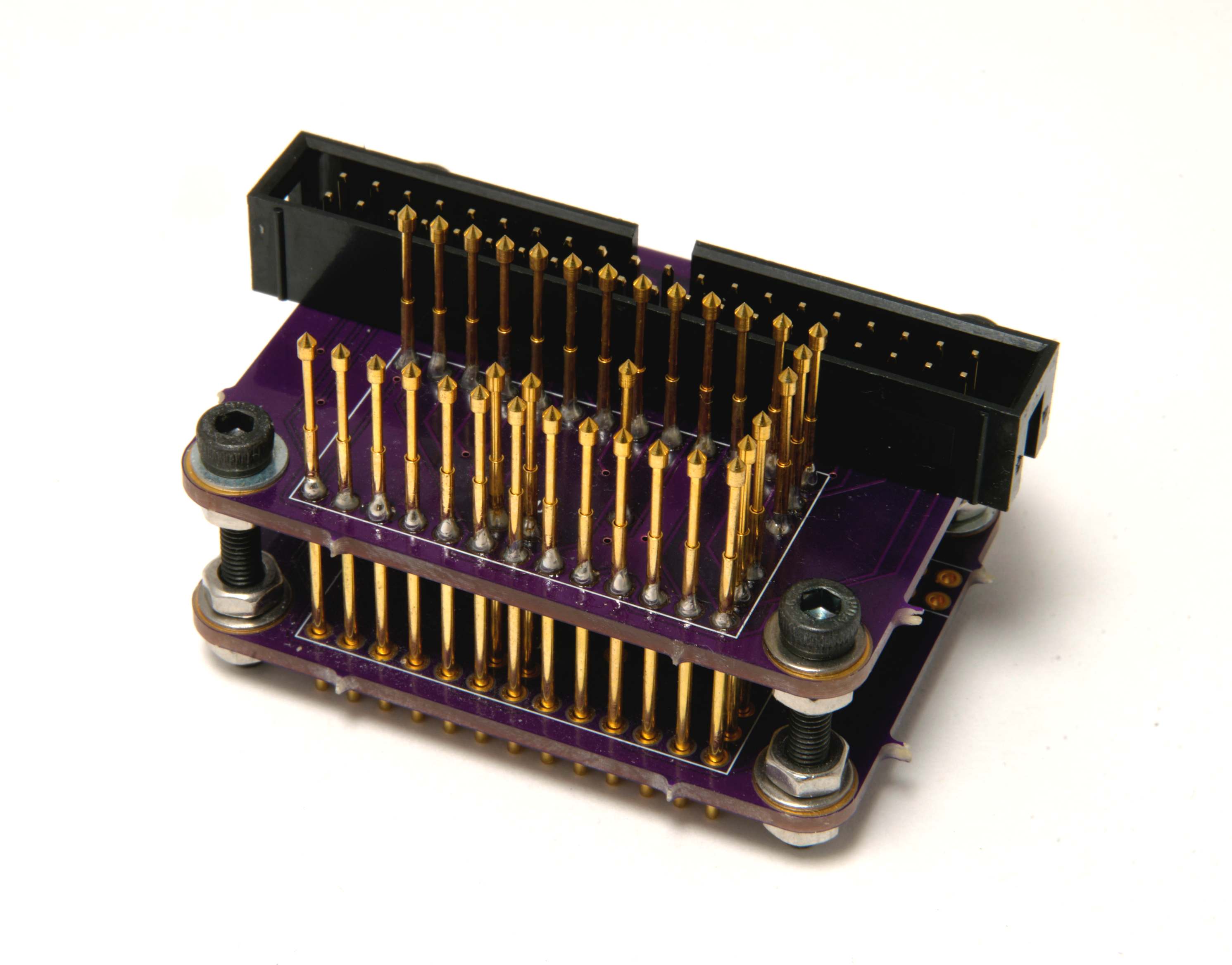 AssemblySolder the 40-pin header first. Note that the notch should be towards the outside, even if the "pin 1" in the kicad files suggests otherwise. Then use the M3 screws to join the two PCBs together. Insert the pogo pins, make sure they are all flat against the table. Solder pogo pins in place on the top, make sure to check for shorts!Problems? Questions? Suggestions? Check out The Crucible. Last modified: April 29th, 2023 - Design by Monica & Fredrik Hübinette |
